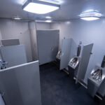 Balanced layout with a mix of private stalls, standard stalls, and urinals; includes a 300-gallon water tank and 1,000-gallon waste tank; 18,000 BTUH ducted system. A great all-around choice for higher traffic.